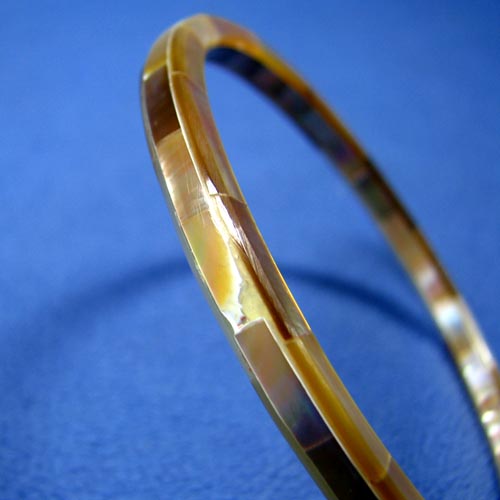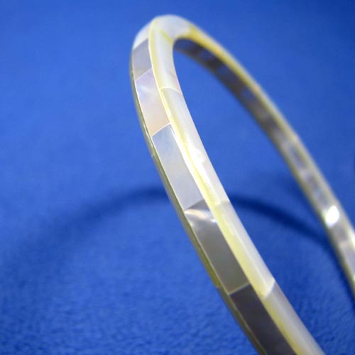 また、モザイク柄のシェルバングルといえばどちらかといえば大きくてちょっと『ごつい』感じのあるものが主流なのですが、大き目のモザイク柄のシェルバングルですとどうしてもカジュアルな服装に限定されがち。