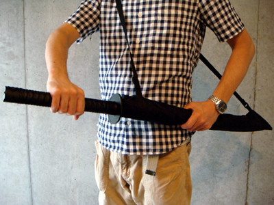 しかも、雨が降っていないときは、肩から下げることができ、さながら“日本刀を腰に差している”ように見えるというから、そのアイデアには恐れ入る。