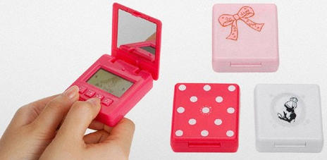 携帯ツールの「女試し。」は、手のひらにすっぽり収まるサイズの四角いコンパクトのようなデザインで、開くとモノクロの液晶画面と鏡が現れる。